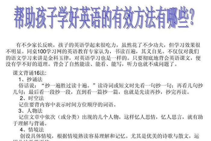 孩子学习英语需要多方面的努力和配合。家长应该根据孩子的兴趣和特点,选择合适的学习方法,让孩子在愉快的氛围中学习英语,逐步提高英语水平。